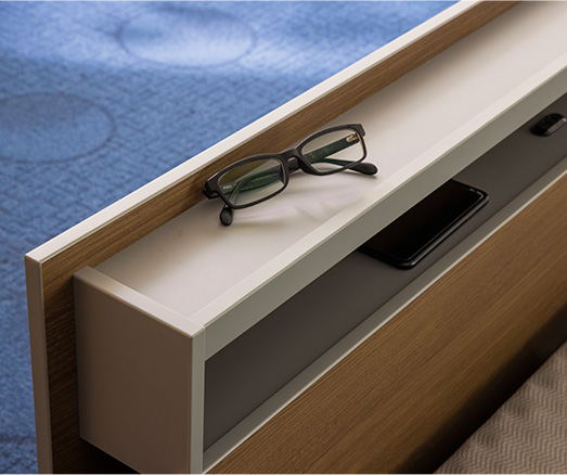 モデルによっては、コンセント付きで、小物やスマートフォンなどを置けるスペースを備えたタイプもございます。